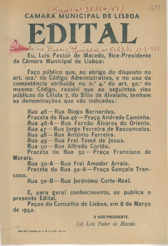 Historial: Na sua reunião de 26 de Novembro de 1951 a Comissão Consultiva Municipal de Toponímia ocupou-se do um pedido formulado pelos moradores da célula sete do Sítio de Alvalade, no sentido de que fossem atribuídos topónimos às ruas da dita célula. A comissão propôs os seguintes nomes: Diogo Bernardes (antiga rua 46), Andrade Caminha, Fernão Álvares do Oriente, Jorge Ferreira de Vasconcelos, António Ferreira, Frei Tomé de Jesus, Alfredo Cortês, Francisco de Morais, Frei Amador Arrais, Gonçalo Trancoso e Jerónimo Corte-Real.