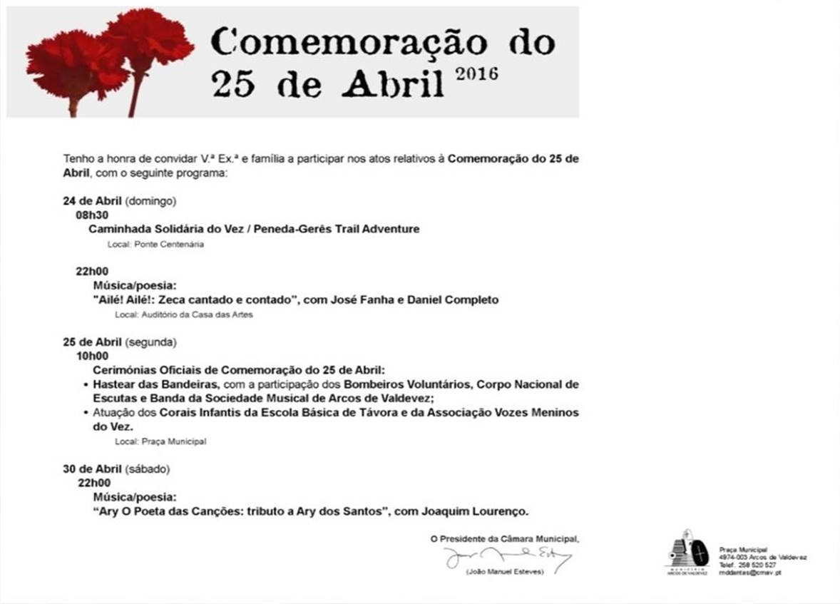 Desta feita, o Presidente da Câmara Municipal, João Manuel Esteves, convida todos os munícipes a assistirem e participarem nas celebrações que incluem no dia 24 de Abril (domingo), pelas 08h30, a Caminhada Solidária do Vez/Peneda-Gerês Trail Adeventure com saída da Ponte Centenária, e às 22h00 o espetáculo de música/poesia “Ailé! Ailé!: Zeca cantado e contado”, com José Fanha e Daniel Completo, no auditório da Casa das Artes; no dia 25 (segunda-feira), pelas 10h00, decorrerá a Cerimónia Oficial do hastear das Bandeiras na Praça Municipal– após a Salva de Morteiros, que terá lugar pelas 9h00 – que contará com guarda de honra efetuada pelos Bombeiros Voluntários de Arcos de Valdevez, Corpo Nacional de Escutas – Agrupº214 e Banda da Sociedade Musical Arcuense, seguida de uma atuação dos Coros Infantis da Escola de Távora e Vozes Meninos do Vez.