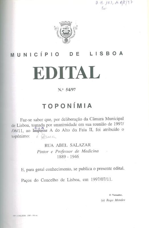 Historial: O topónimo Rua Abel Salazar foi atribuído pela Câmara Municipal de Lisboa, através de Deliberação Camarária de 11/06/1997 e Edital de 11/07/1997, ao arruamento com a denominação provisória de Rua “A”, do Alto da Faia II.
