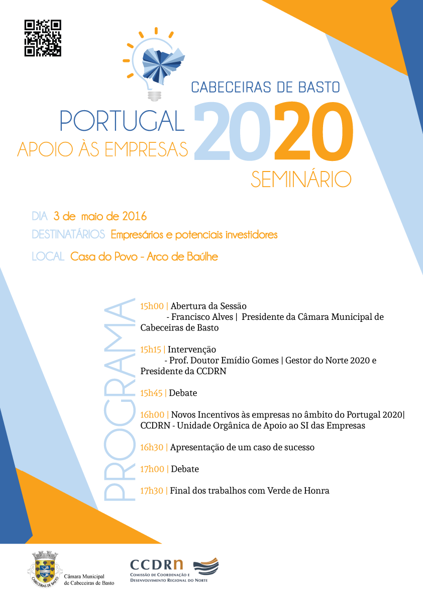 A Câmara Municipal de Cabeceiras de Basto encontra-se a promover o Seminário ‘Portugal 2020 - Apoio às Empresas’, uma iniciativa que decorre no próximo dia 3 de maio, terça-feira, na Casa do Povo do Arco de Baúlhe, a partir das 15h00, e que tem como destinatários os empresários e os potenciais investidores.