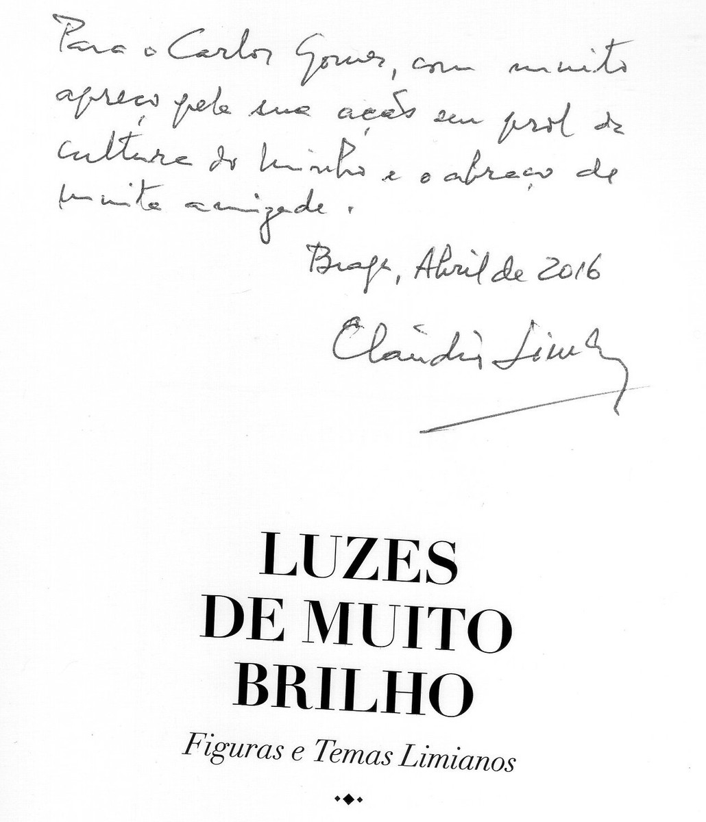 “Luzes de muito brilho – Figuras e Temas Limianos” é a mais recente obra publicada do escritor ponte-limense Cláudio Lima, pseudónimo literário de Manuel da Silva Alves. Trata-se de uma coletânea de ensaios publicados ou proferidos pelo autor, abordando invariavelmente personalidades de relevo da vida literária ou artística de Ponte de Lima ou ainda a temas considerados relevantes na vida local.