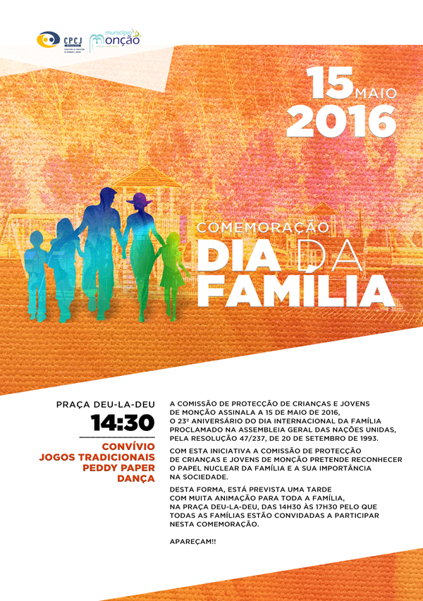 A Comissão de Proteção de Crianças e Jovens de Monção assinala este domingo, 15 de maio, na Praça Deu-la-Deu Martins, a partir das 14h30, o 23º aniversário do Dia Internacional da Família através da realização de várias atividades destinadas a pais, filhos, avós e netos.
