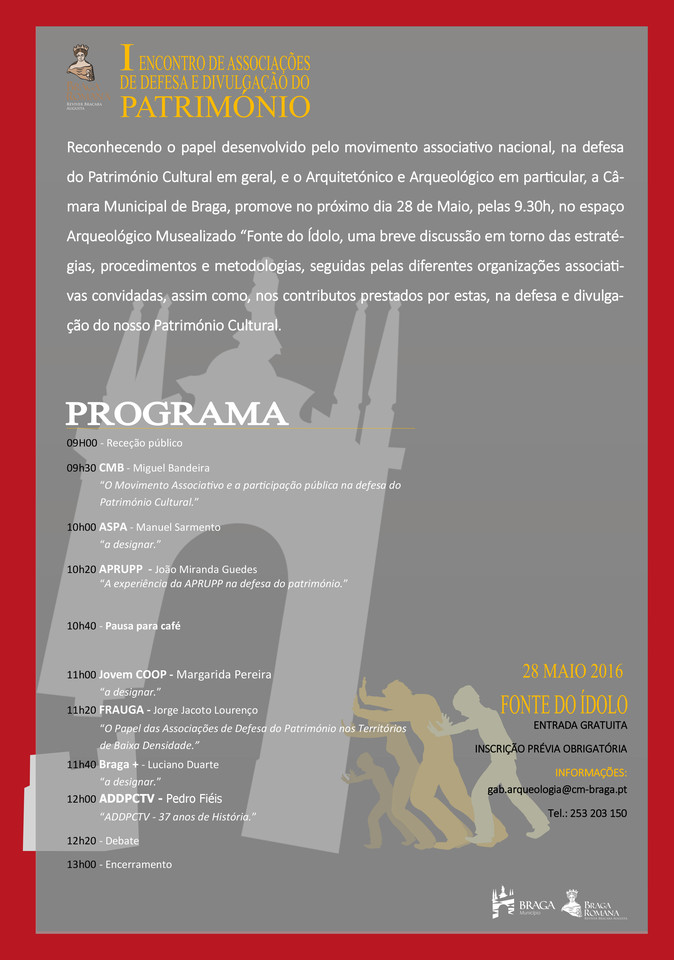 Reconhecendo o papel desenvolvido pelo movimento associativo nacional na defesa do Património Cultural em geral, e o Arquitectónico e Arqueológico em particular, a Câmara Municipal de Braga promove, no próximo dia 28 de Maio, pelas 09h30, no espaço Arqueológico Musealizado “Fonte do Ídolo, uma breve discussão em torno das estratégias, procedimentos e metodologias, seguidas pelas diferentes organizações associativas convidadas, assim como nos contributos prestados por estas na defesa e divulgação do nosso Património Cultural.