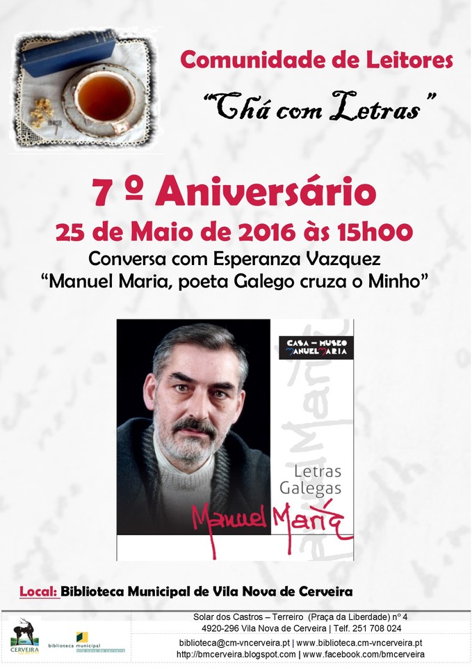 A Comunidade de Leitores de Vila Nova de Cerveira – ‘Chá com Letras’ assinala, esta quarta-feira, mais um aniversário com uma sessão especial dedicada ao poeta Manuel Maria, homenageado no Dia das Letras Galegas 2016. A Biblioteca Municipal convida a população a participar nesta atividade que conta com a presença de Esperanza Vázquez.
