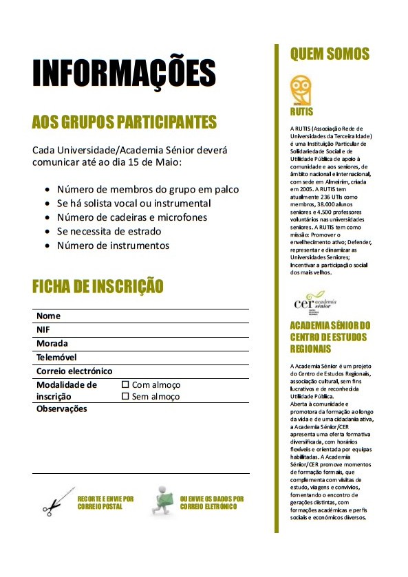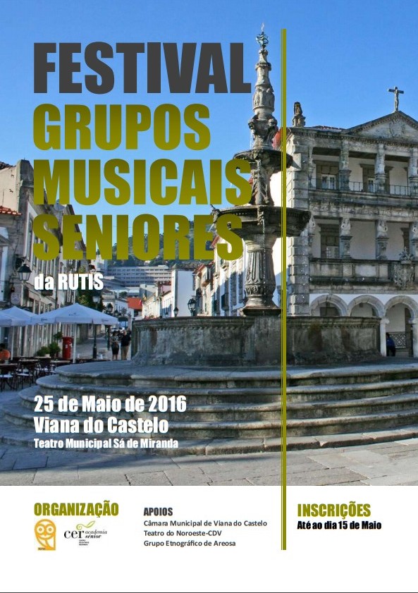 No próximo dia 25 de Maio, quarta-feira, em Viana do Castelo, realiza-se o Festival de Grupos Musicais Seniores da RUTIS, organizado pela Academia Sénior do Centro de Estudos Regionais.