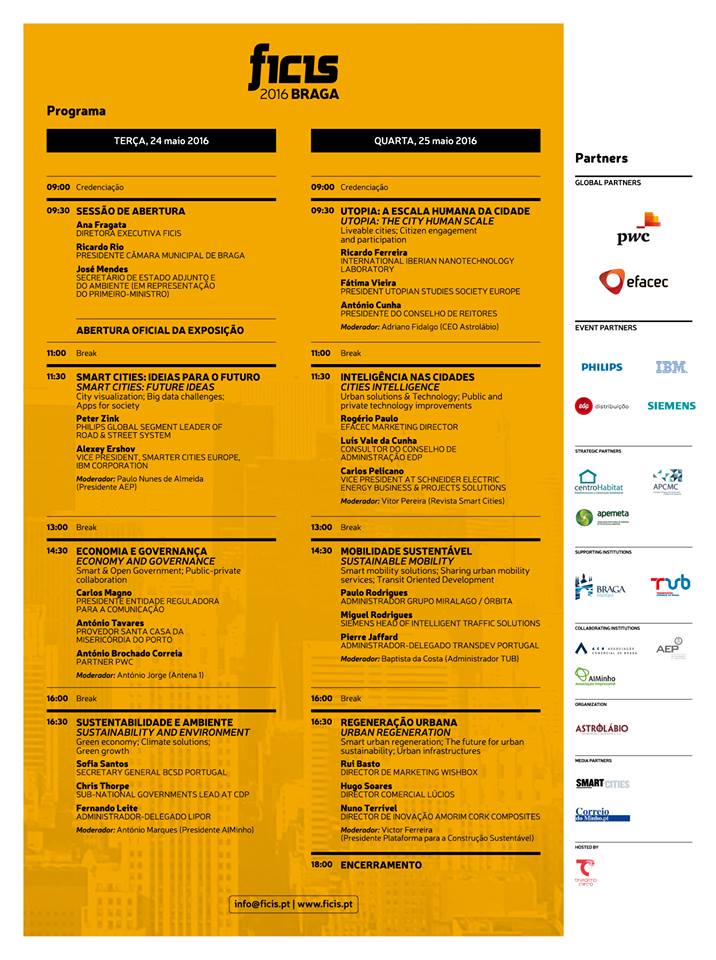 Para discutir temas como a mobilidade sustentável, o ambiente, a governança e a regeneração urbana, o FICIS 2016, onde se estima a presença de cerca de 2500 pessoas ao longo dos dois dias do evento, vai contar com os contributos de responsáveis internacionais da Philips, IBM, INL (Laboratório Ibérico Internacional de Nanotecnologia), Siemens, Schneider Electric, BCSD (Business Council for Sustainable Development) e do CDP (Carbon Disclosure Project).