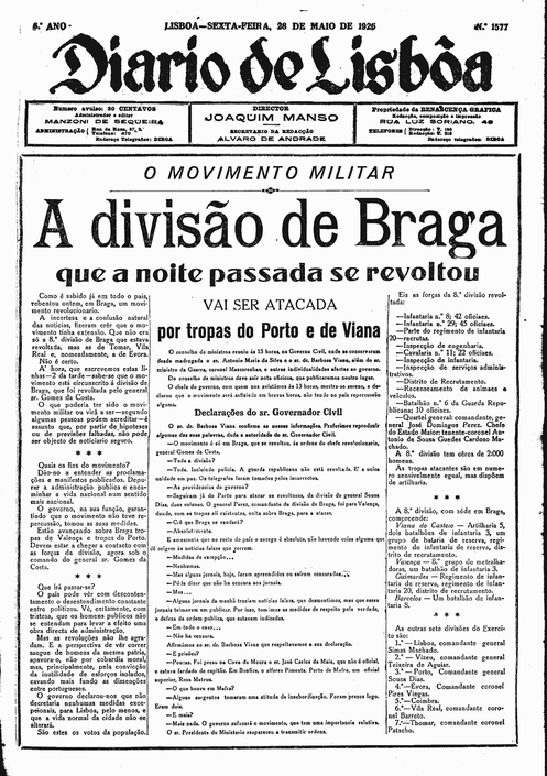 “Em 28 de Maio de 1926 ocorre um levantamento militar no norte de Portugal, com o objectivo de tentar repor a ordem no país, que durante os últimos dois anos (desde 1924) está continuamente à beira da guerra civil.
