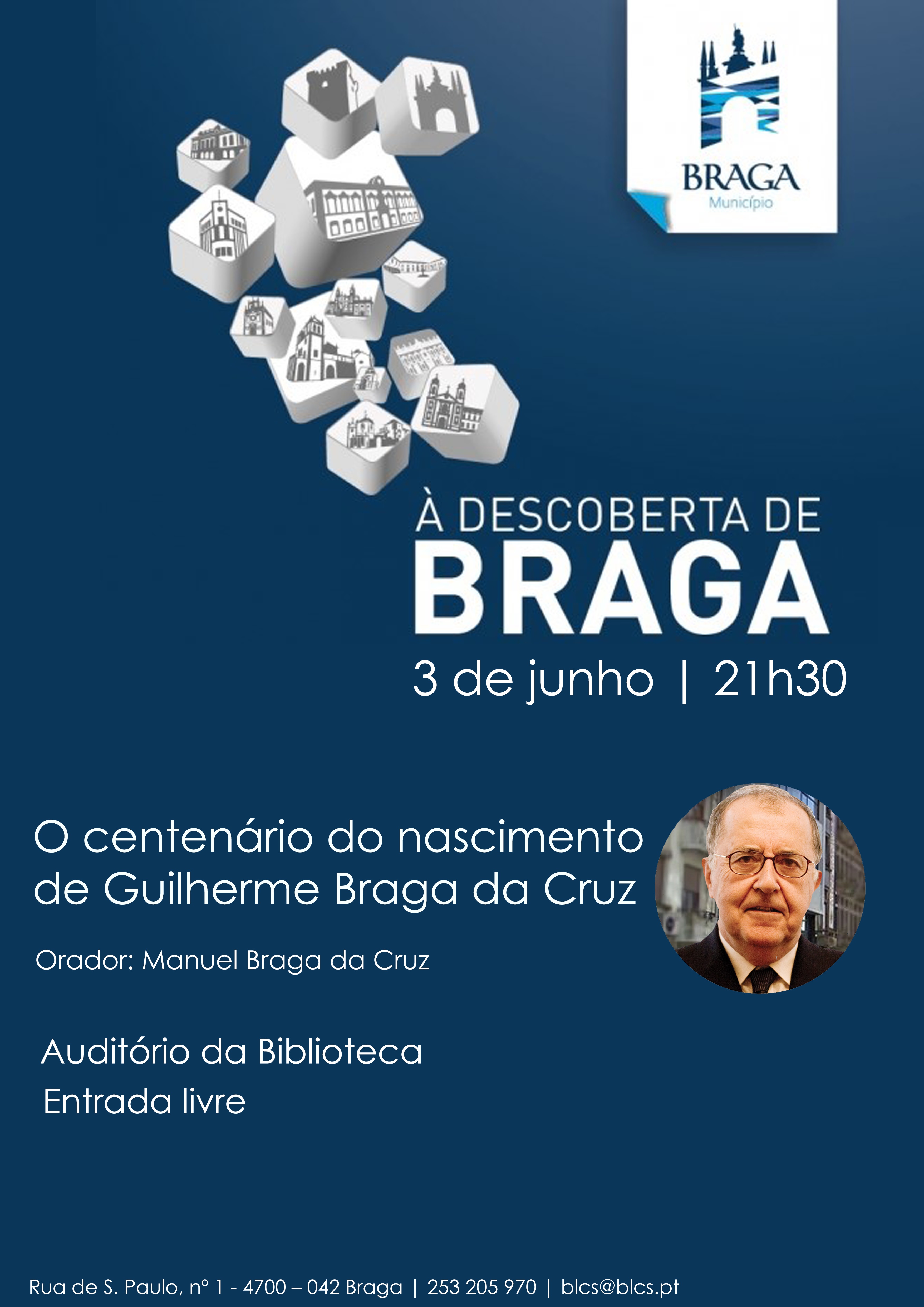 O Município de Braga assinala esta Sexta-feira, dia 3 de Junho, o centenário do nascimento de Guilherme Braga da Cruz, antigo Reitor da Universidade de Coimbra e distinto académico, que nasceu em Braga a 11 de Junho de 1916 e veio a falecer a 11 de Março de 1977 na cidade do Porto.