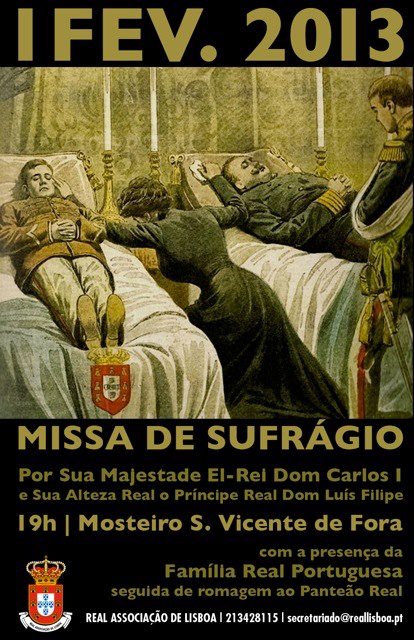 No âmbito do 105º aniversário sobre o trágico assassinato que vitimou Sua Majestade, O Rei Dom Carlos I e Sua Alteza Real o Príncipe Dom Luís Filipe, no próximo dia 1 de Fevereiro de 2013, a Real Associação de Lisboa mandará celebrar em homenagem a estes augustos mártires da nossa Pátria uma missa na Igreja de São Vicente de Fora, ao que se seguirá uma romagem ao Panteão Real onde será depositada uma coroa de flores junto aos túmulos de El-Rei e do Príncipe Real por Suas Altezas Reais os Duques de Bragança, Dom Duarte e Dona Isabel.