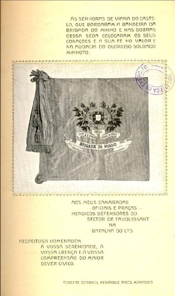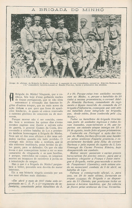 A Briga do Minho! Ninguém, que o conheça, fala hoje d’esse galhardo núcleo de tropas portuguezas, que se não sinta estremecer à evocação das famosas legiões d’outros tempos, que no mais aceso da ação tinham o que quer que fosse de aparições lendarias, ás quaes só estava reservado o extremo glorioso de vencerem ou morrerem.