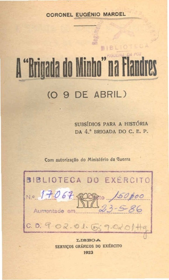 A imagem mostra a capa de um exemplar do livro “A Brigada do Minho na Flandres: o 9 de Abril. Relatório da Batalha e sua Documentação”, da autoria do Coronel Eugénio Mardel, atualmente pertencente atualmente à Biblioteca do Exército.