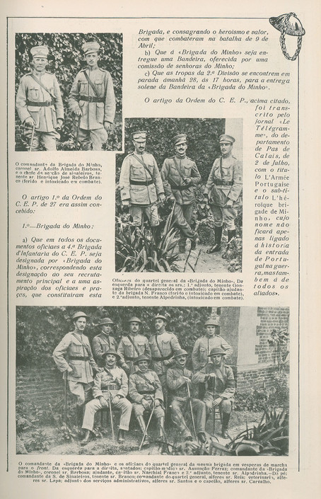 Porque morrer não é ser vencido, como também o acentuou há quinze dias n’estas mesmas paginas esse valente e ilustre cabo de guerra, o General Gomes da Costa, descrevendo a celebre batalha de Lys, e prestando também homenagem á Brigada do Minho. Nem um só dos seus oficiaes e dos seus soldados vacilou quando viu tudo perdido. O inimigo não deitou mão a nenhum, que já não estivesse inutilizado, pelas feridas ou pelos gazes, para se defender. Os que ele não levou e que conseguiram tornar a ver os seus camaradas da retaguarda e as suas famílias, é porque, estendidos no campo, os julgaram mortos ou incapazes de resistirem á perda ou á intoxicação de sangue.