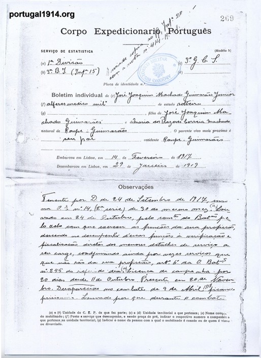 José Joaquim Machado Guimarães Júnior nasceu a 17 de Fevereiro de 1890 no lugar da Igreja, freguesia de Ronfe, Guimarães, descendente de uma família com antiga tradição na área dos têxteis do vale do Ave. Contudo, a sua vocação era a Medicina. Tendo ido estudar para o Porto, quando se licenciou na Escola Médico-cirúgica do Porto o país já estava envolvido na conflagração europeia. José Joaquim decidiu então alistar-se como voluntário no exército. Foi integrado no 3º Grupo da Companhia de Saúde, cujos elementos provinham da região do Porto, fazendo parte do Serviço Médico do Corpo Expedicionário Português, enviado para terras de França, a combater na Frente Ocidental. Embarcou a 15 de Fevereiro de 1917 rumo a Brest. Em França ficou adstrito ao Batalhão de Infantaria nº 15 e foi promovido a Tenente-médico miliciano em 24 de Setembro do mesmo ano.