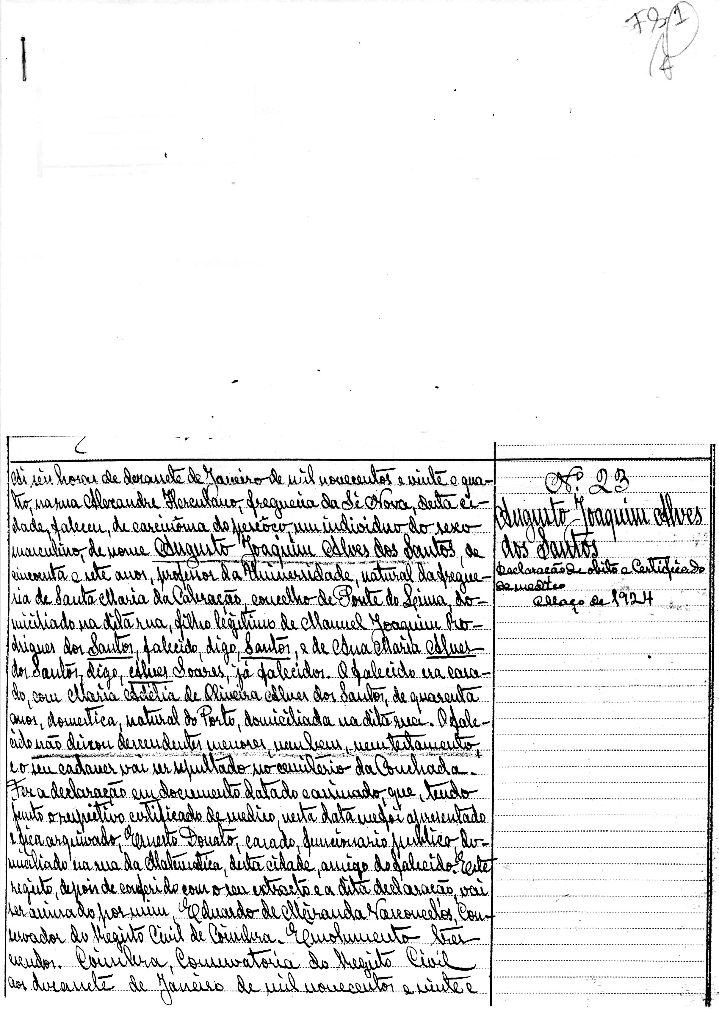 A imagem mostra o assento de óbito de Augusto Joaquim Alves dos Santos da Conservatória do Registo Civil de Coimbra.