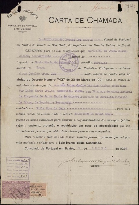 Outros, porém seguiram com “carta de chamada” passada pelo Consulado Português. Foi o caso de Agostinho de Souza Braga, natural da freguesia de Santa maria de Galegos, no concelho de Barcelos, que em 21 de julho de 1926 teve a “carta de chamada” que junto se reproduz.
