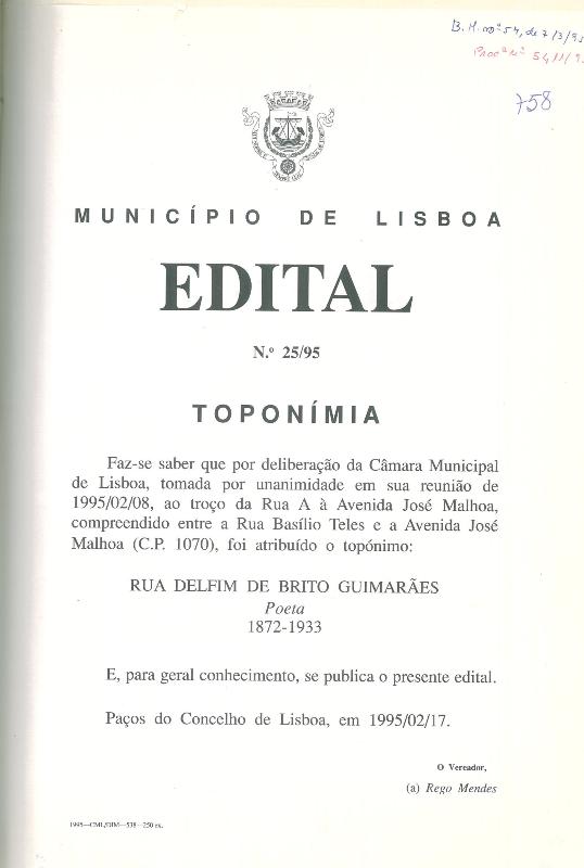 Historial: “Aos vinte e três dias do mês de Setembro de mil novecentos e noventa e quatro pelas dezasseis horas, numa das salas dos Paços do Concelho, reuniu a Comissão Municipal de Toponímia (...) Seguiu-se a leitura de uma carta da casa do Concelho de Ponte Lima, solicitando que o nome do poeta Delfim Guimarães, seja atribuído a uma rua de Campolide, situada nas imediações da sede da referida Instituição.